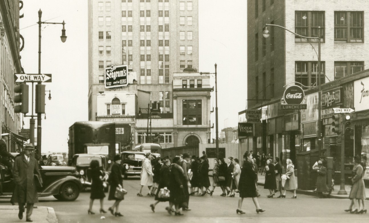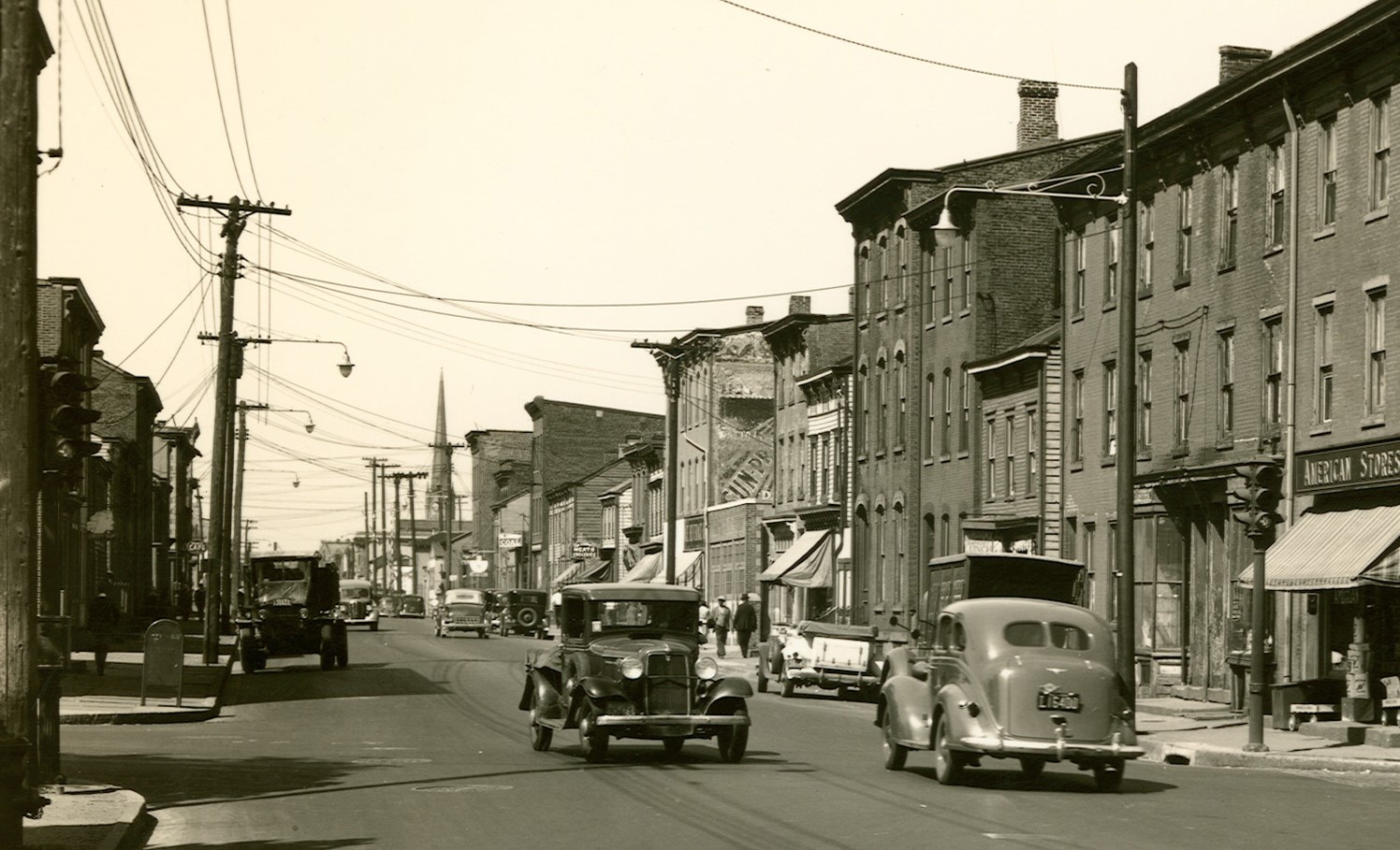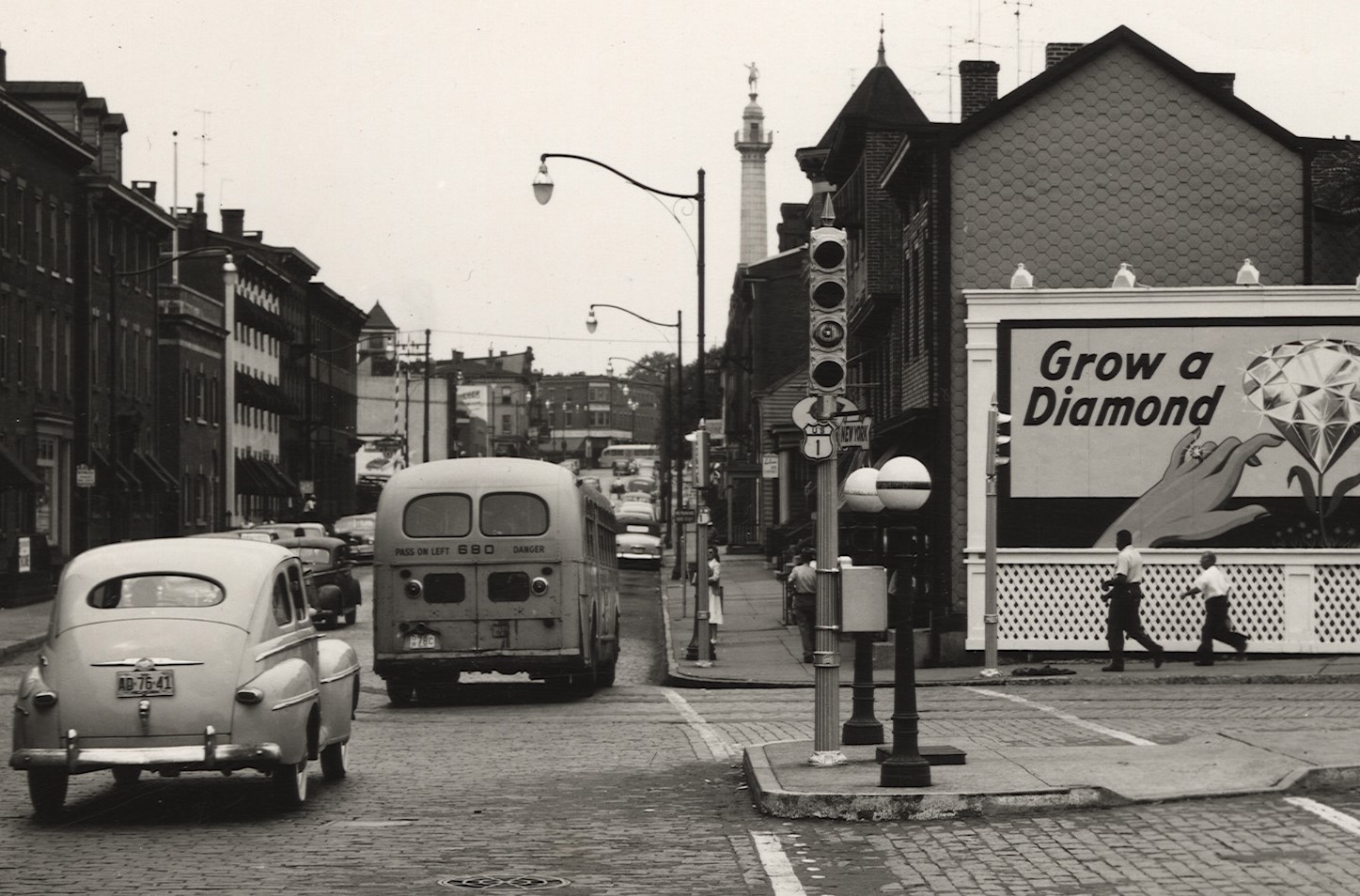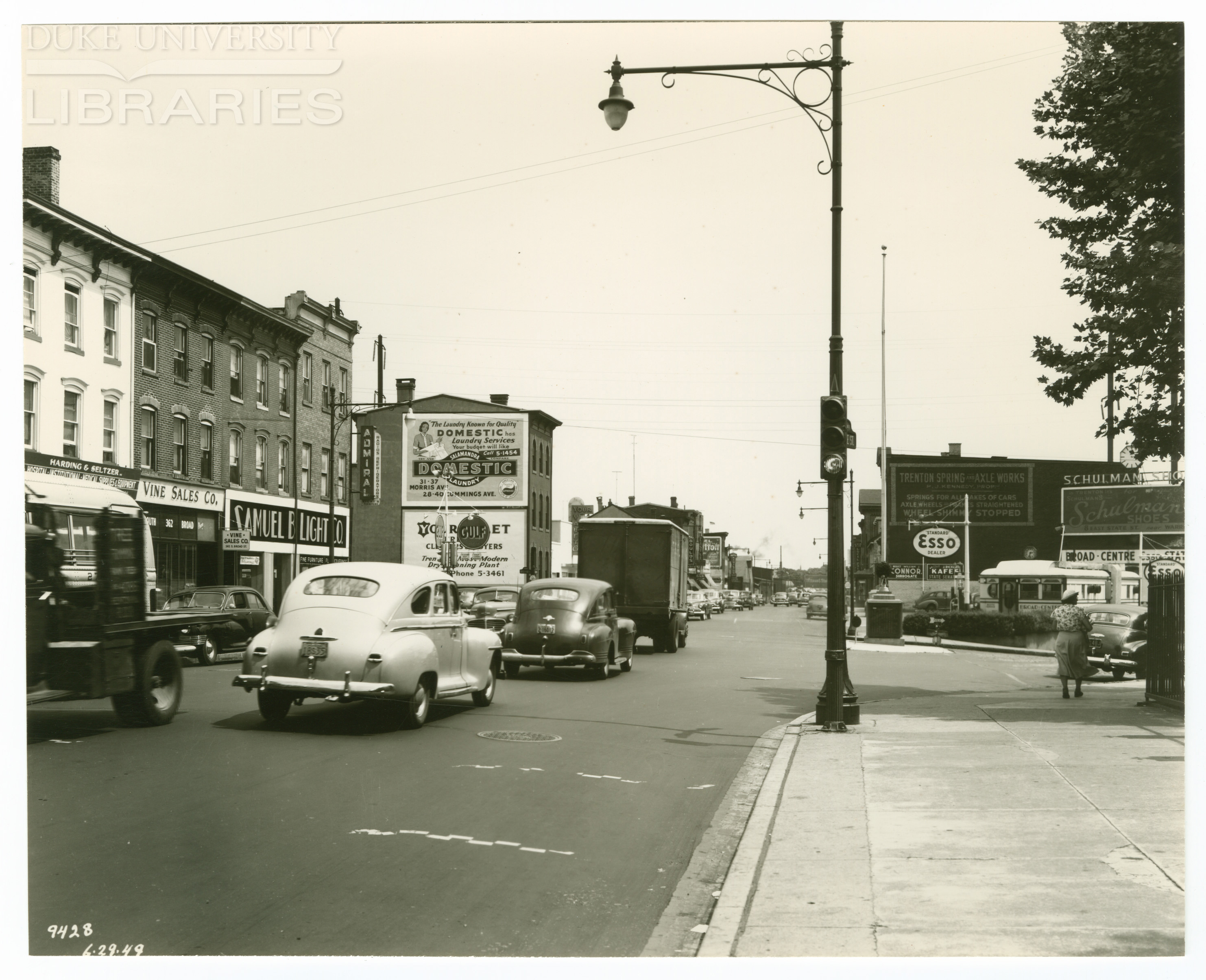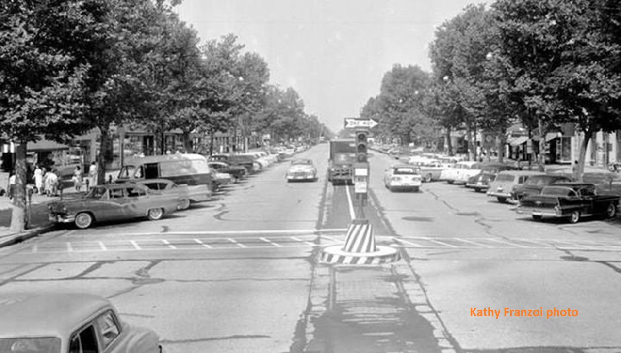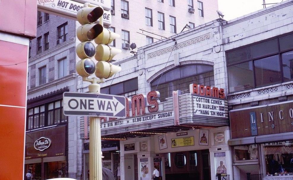Also in Newark, this lovely pedestal by the Adams Theater holds a pair of GE “streamline” signals and a Newark-spec ONE WAY sign in the 1950s.