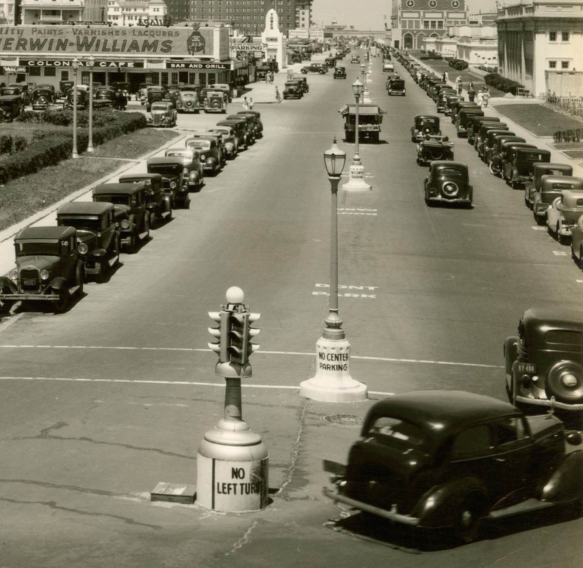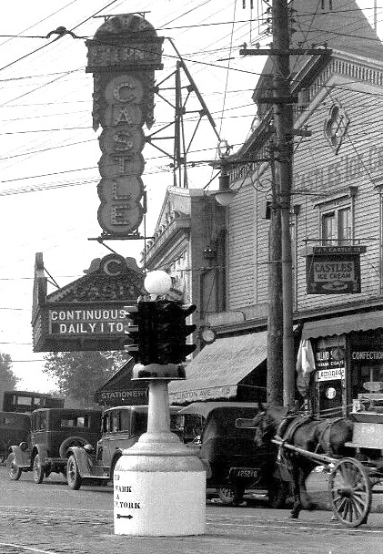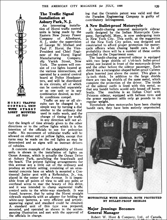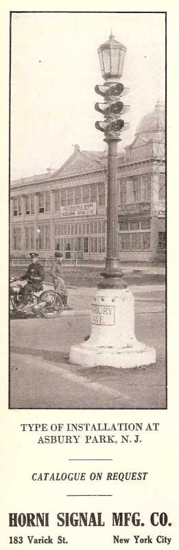 In 1926, Horni Manufacturing Corp. of Newark NJ and NYC, an early pioneer in traffic control, equipped Asbury Park’s Ocean Avenue with these cool variations of their Type 950 pedestal signals. These lights, with their small, uniquely shaped lenses, were specifically selected for their looks, as well as their integrity with the decorative lighting standards in the middle of the avenue. This installation was documented in a small article in The American City Magazine in July 1926.