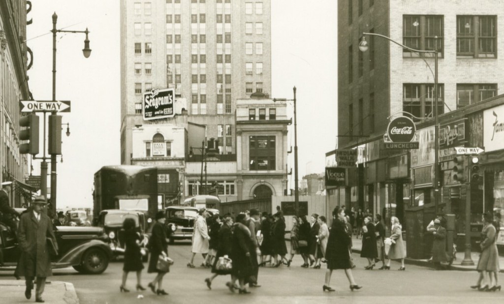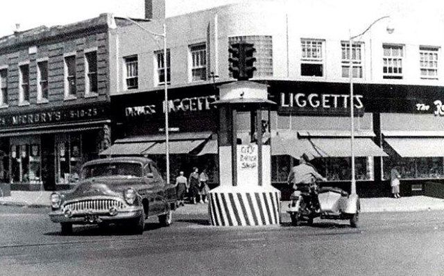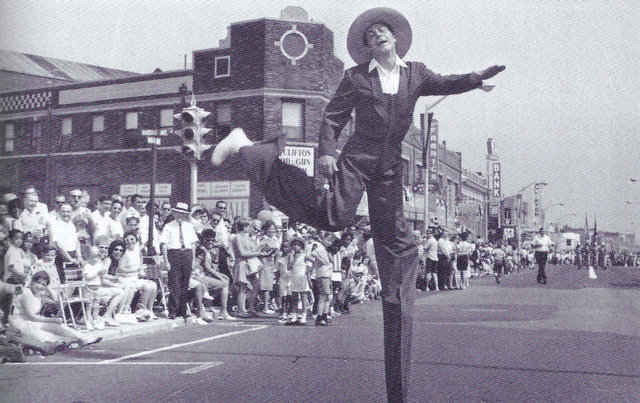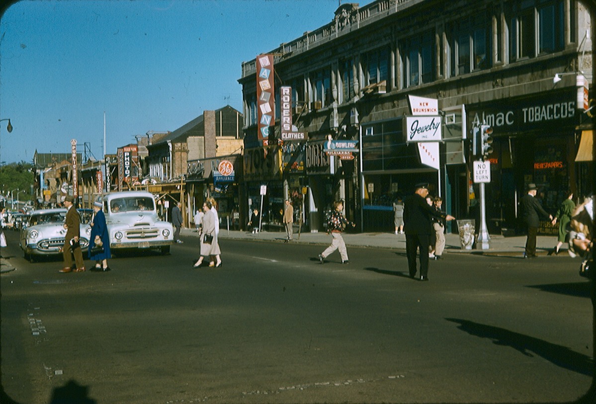 At Main & Harding (one block to the north of the previous photo), a performer on stilts celebrating Clifton’s Jubilee in 1967 points his foot toward a nifty fixed-face 4-way ‘corner-hinged’ Horni signal, circa 1930. I remember this particular light; it always looked very old to me.