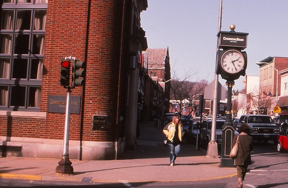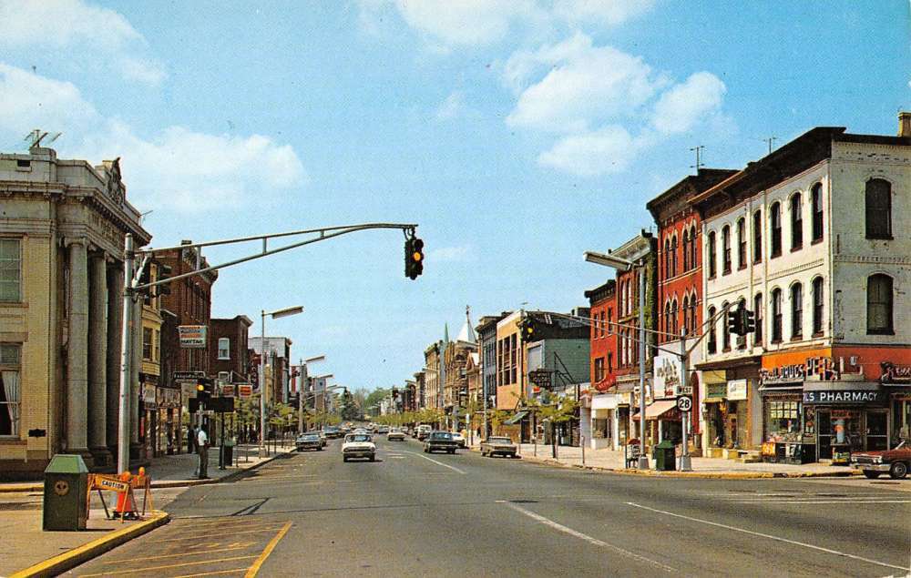 Many of the traffic signals installed on New Jersey’s state and US routes from the 1950s into the ’70s were dark green Marbelites clustered back-to-back. This example is from NJ-US Route 46 in Hackettstown. Pedestal-mount signals, like the one in the foreground, or side-of-pole signals, were often added for better visibility by pedestrians. This was a lazier/cheaper solution, compared to wiring in pedestrian signals with crosswalk phases.