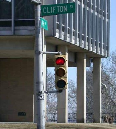A late 1940s pedestal at the corner of Main & Clifton Avenues is topped by a 4-way adjustable Marbelite signal with uniquely scalloped “AGA” style visors. Marbelite evidently has surplus visors from their takeover of Signal Service Corp at the end of 1945.