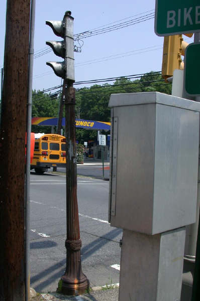 From Todd Jacobson’s wonderful Flickr albums, this photo was taken on Valley Road in Montclair in 1992. I believe the signal heads are GE “Groovebacks”. They look more modern than the ornate pedestal, but when you consider that Groovebacks were first made in 1937, this could be 100% original.