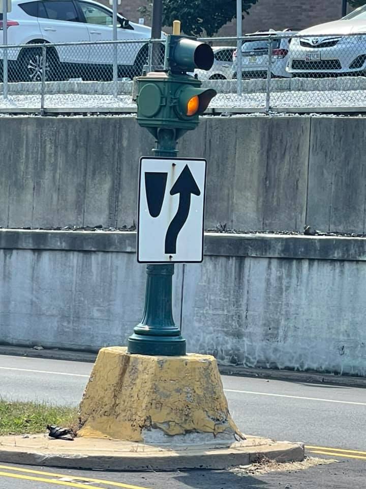 Center: The Crouse-Hinds Type T signal at the entrance to the ferry is a bit of a mystery. The visors and the amber Adler lens are rotated 90 degrees (thanks to Highway Divides member Stavros for noticing the Adler lens). The MOVE ON GREEN ONLY sign may have been a precursor to NO TURN ON RED.