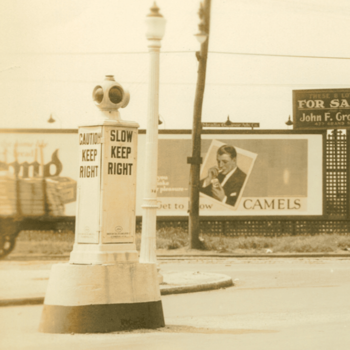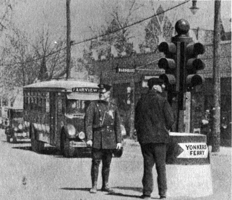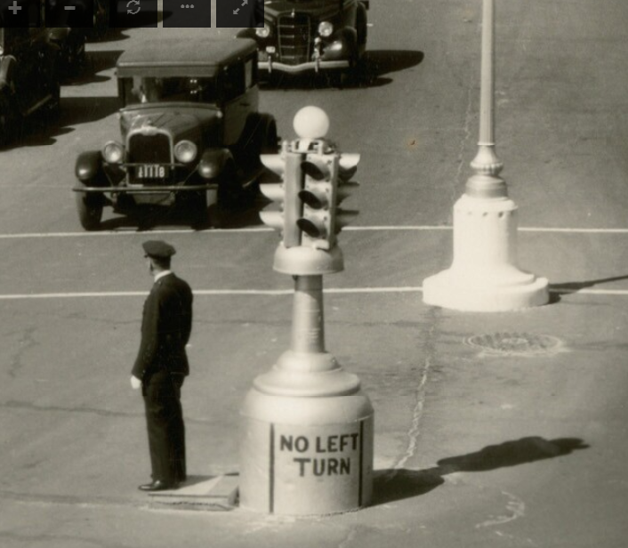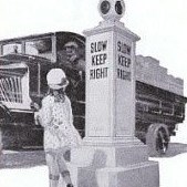 In many busy intersections of the early years, the simple flashing island beacon was used to keep traffic flowing where it was supposed to. The American Gas Accumulator beacon on the left was photographed in Jersey City in 1927. The graphic on the right, from an AGA advertisement, provides a reminder that children once freely roamed the planet.