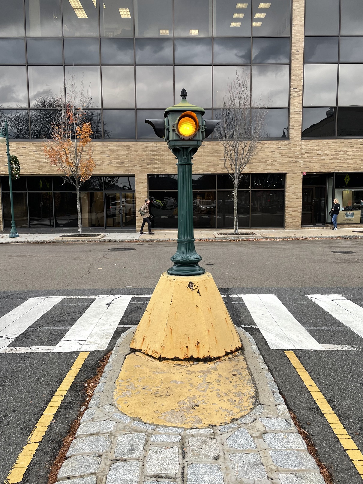 Just a few miles up the road in downtown New Brunswick, we find circa 1920s Crouse-Hinds Type T signals with decorative hardware at the corner of George & Albany Streets.