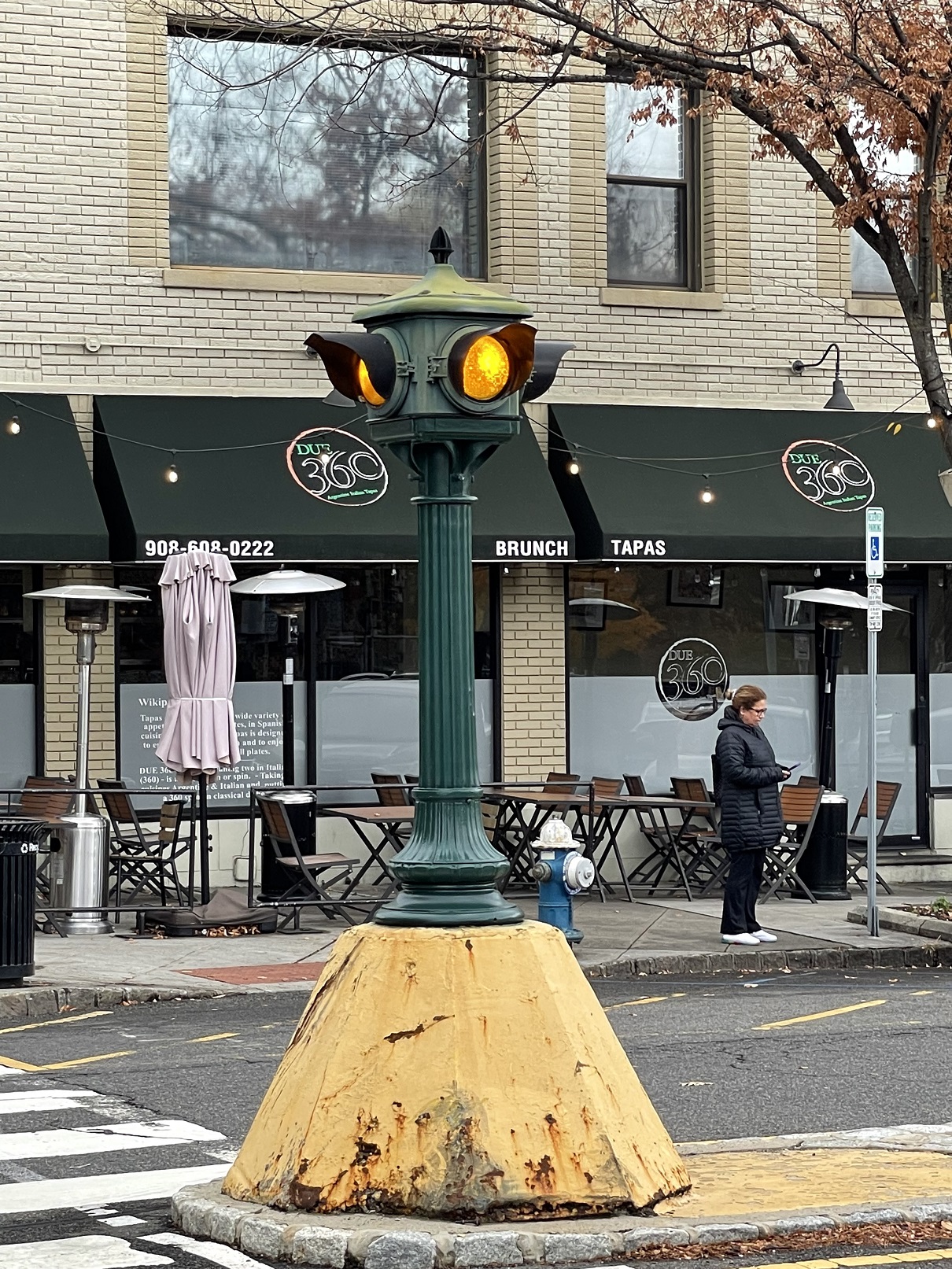 These late 1920s American Gas Accumulator “safety zone” signals in Summit, along with the Maplewood beacon above, could be the oldest signals in service in New Jersey. As of this writing, they are still operating, retrofitted with LEDs.