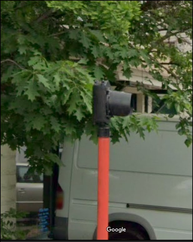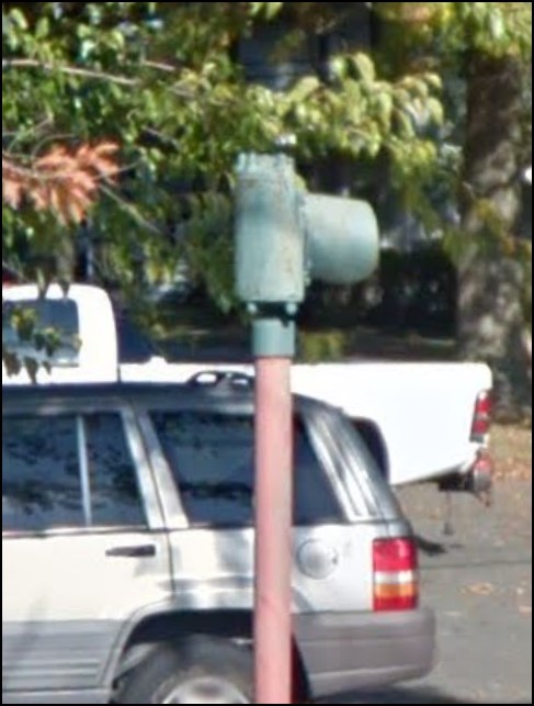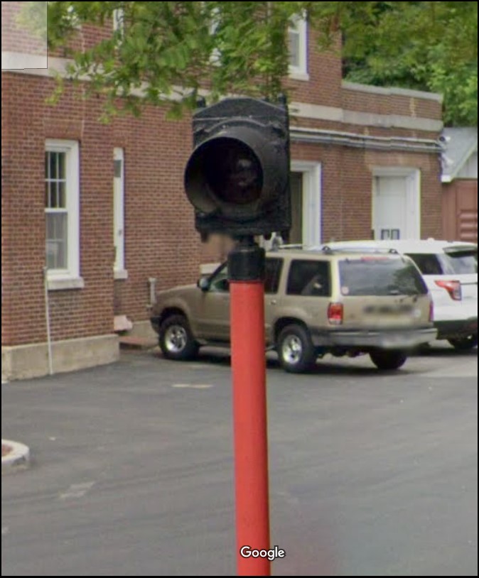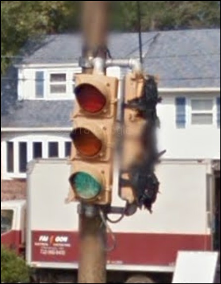 Several years ago, New Jersey collector Chris Sebes posted photos in an online forum of an unusual looking pair of old signals in East Rutherford. After some discussion among several collectors, we identified them as Horni Signal heads made of Bakelite, an early form of rigid plastic, typically used for old telephones, during the war-time restrictions on aluminum. These are an exceptionally cool find, and probably, or so we thought, the last of their kind. It is also a rare glimpse of an early bracket set up on tall posts. The four Google images below are of the Horni Bakelite pair: