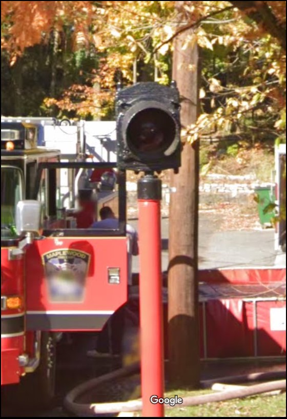 Lovingly maintained in front of Maplewood’s Fire Department Headquarters is this easily-missed, single-lamp beacon with porthole doors and tie rods, made by Crouse-Hinds in the 1920s. Along with the AGA beacons in Summit (below), this is probably the oldest signal head still on the streets of Jersey. I have not been in the area for years to photograph it myself; I am very curious to know if the lens is original.