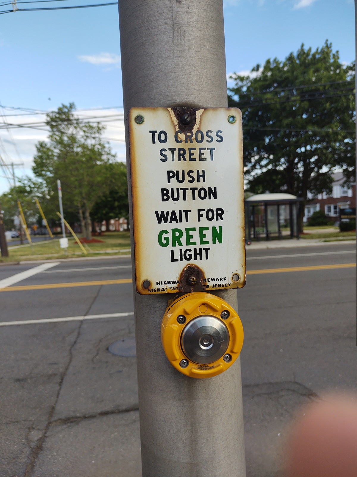 Pedestrians have always had it rough in New Jersey. Where I grew up in northern NJ, pedestrian signals were more the exception than the norm. Many intersections had no pedestrian signal heads, but came equipped with crosswalk buttons instructing you to push the button and WAIT FOR GREEN LIGHT. I assume that pushing the button sent a notification to the controller that a person was waiting to cross, thus hastening the change of the light to green. Good luck with expecting New Jersey drivers to yield to you as you cross!