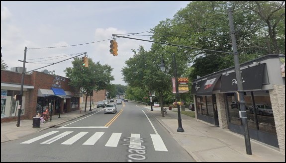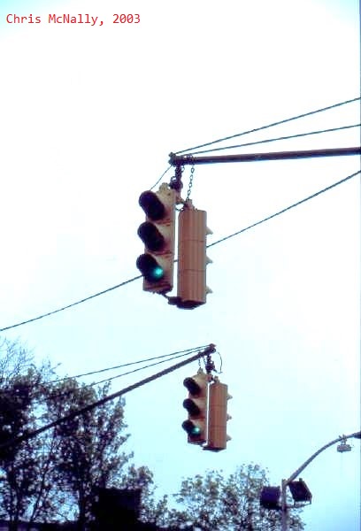 Above: The city of Bloomfield installed a number of signalized crosswalks on Broad Street and Belleville Avenue in the 1940s. These rather charming Crouse-Hinds installations employed 8″ vehicular heads with Kopp WAIT and WALK lenses. This crosswalk is at the former A&P on the corner of Broad and Warren. I can recall the WAIT-WALK signals were still operating as late as the 1980s, but eventually were replaced by square ped heads. The original overhead vehicular lights held on until 10-15 years ago. Today, the original masts still remain. Note the USE CROSSWALK AT LIGHT sign in the first photo.