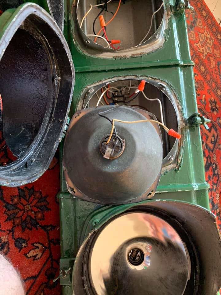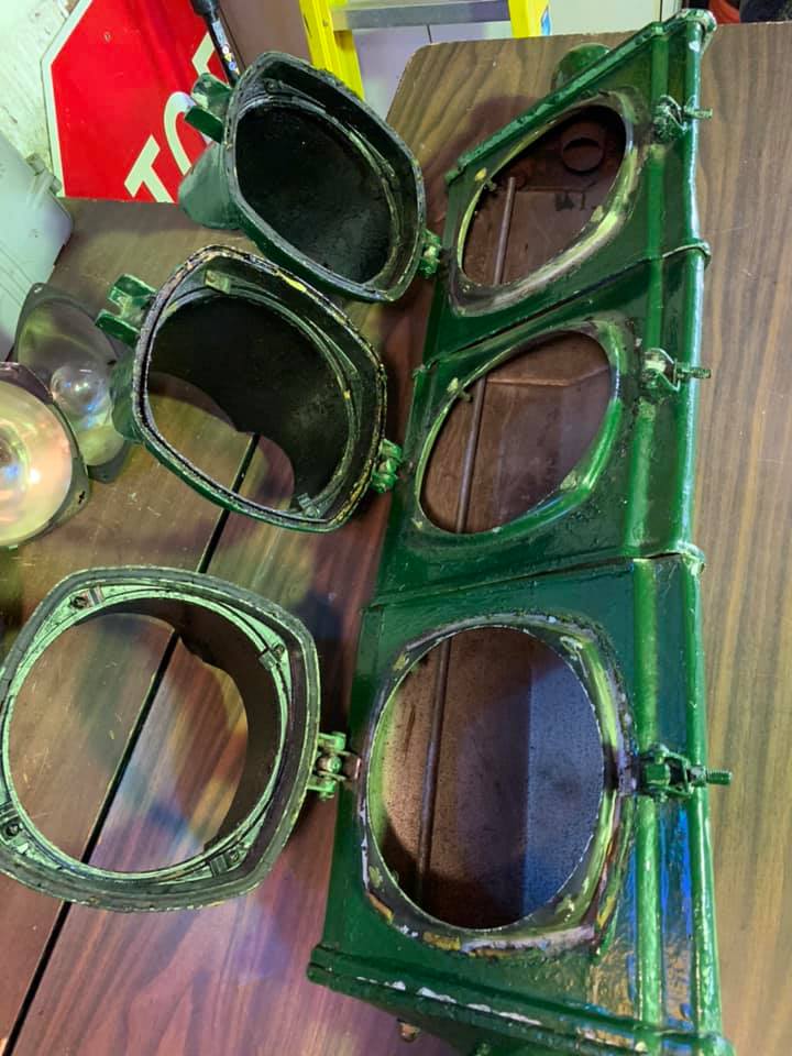 After the initial cleaning and test wire-up (video above), John cleaned and dismantled the light, and did some work to straighten a bent housing. He noticed that the original paint was silver, which was pretty common for signals installed in New Jersey before WWII.