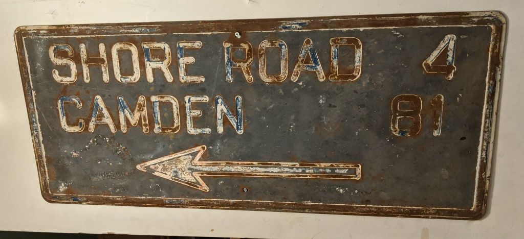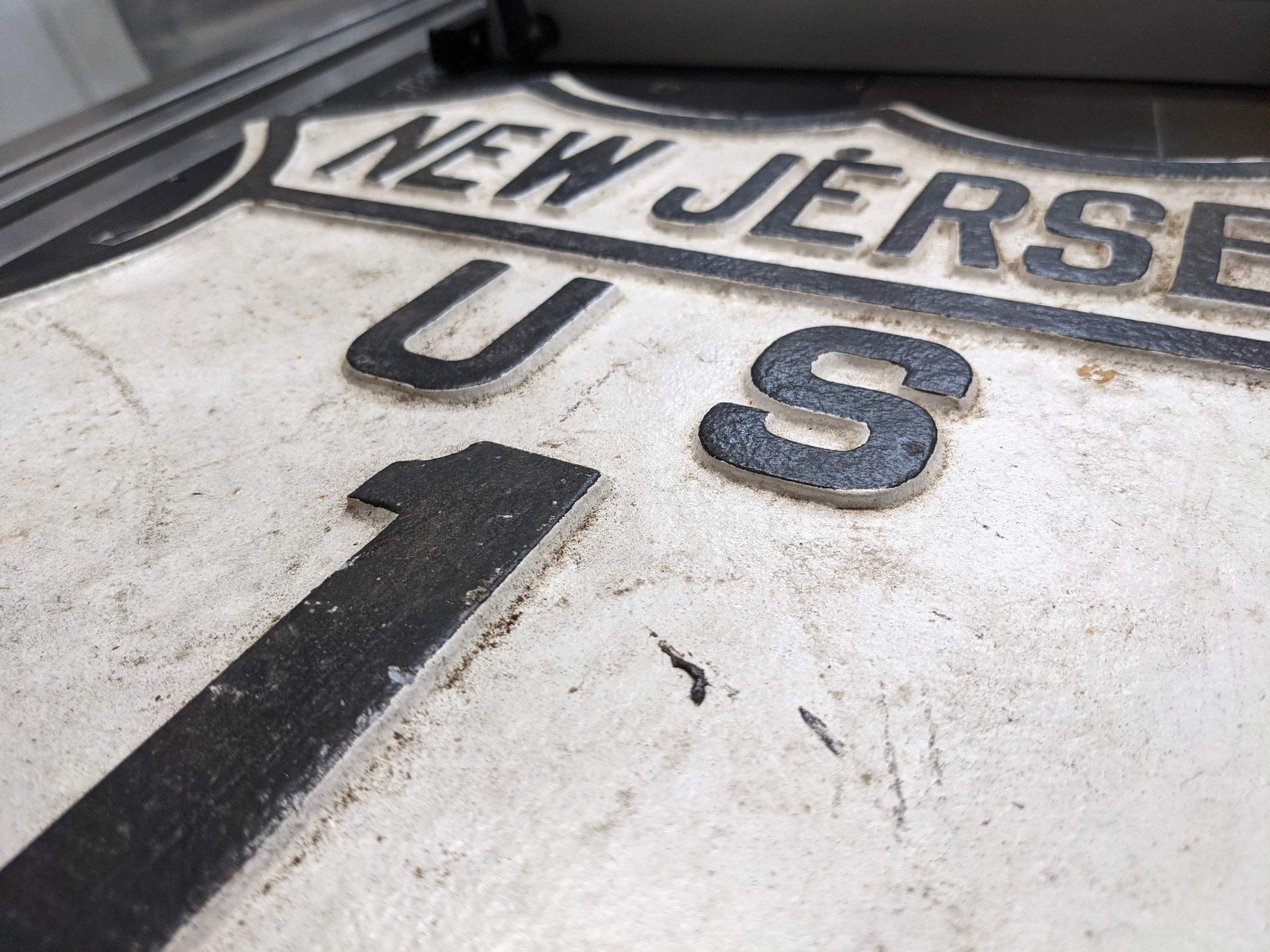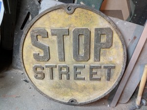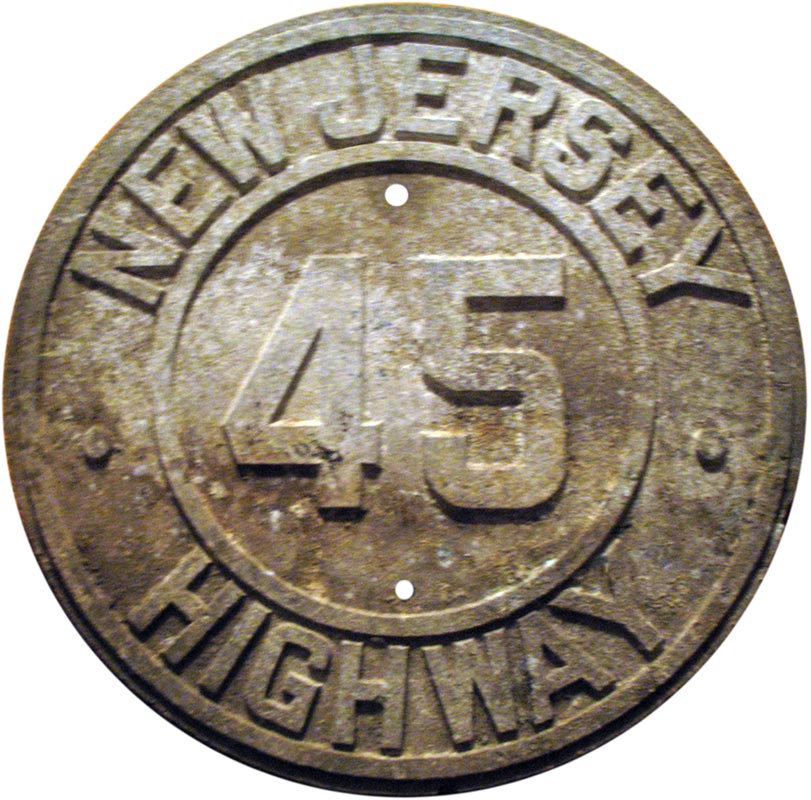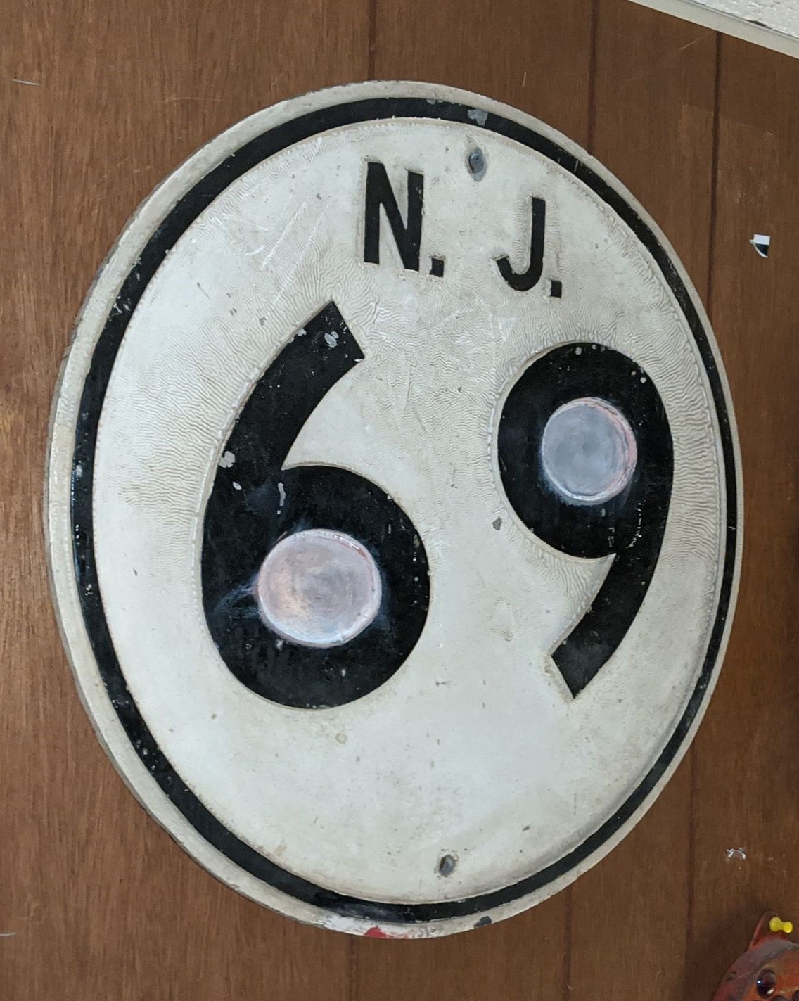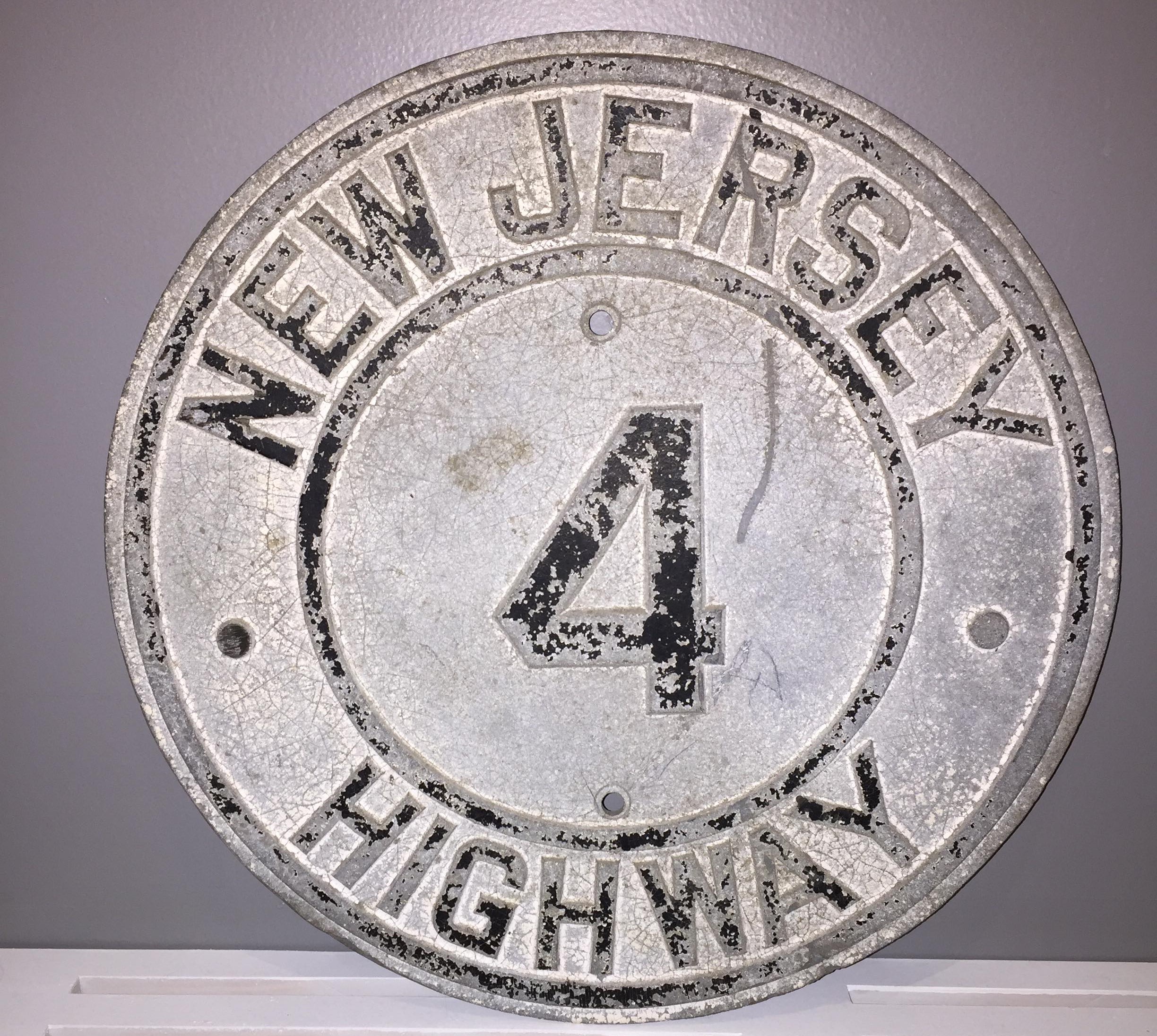 Ed has some really wonderful regulation signs. The cast One Hour Parking sign is from Atlantic City. The cast round STOP is Jersey-specific, and looks similar to one Ben Kranefeld photographed in a someone’s front yard.