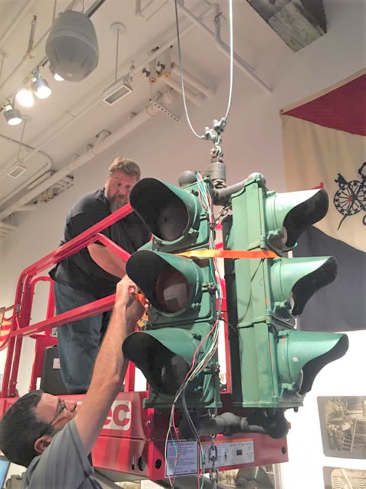 This signal probably weighs upwards of 200 pounds. Getting it hung from the museum ceiling was a challenge that had some tense moments. Randy did a masterful job as we helped from below, but mostly just watched in awe.