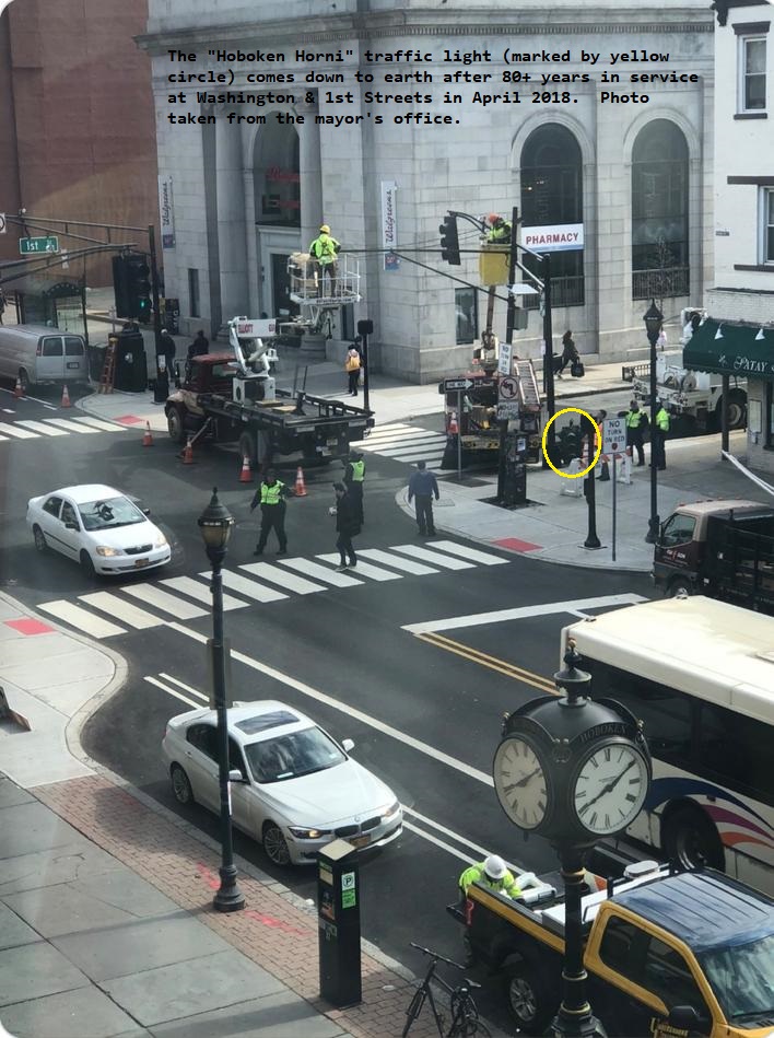 After more than 80 years in service, the “Hoboken Horni” traffic signal at the corner of Washington St. and 1st St. was finally replaced in April 2018. The signal collecting community was keenly interested in the fate of this classic and exceptionally long-lived piece of American road history. As soon as he knew of Hoboken’s plan to refurbish Washington Street, my good friend Chris McNally (a dedicated volunteer at the Baltimore Streetcar Museum) contacted the city in the hope of working out a plan to preserve the signal. He got the attention of some historic minded people in the city government and ultimately got the Hoboken Historical Museum on board with saving the light.