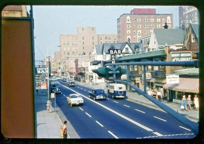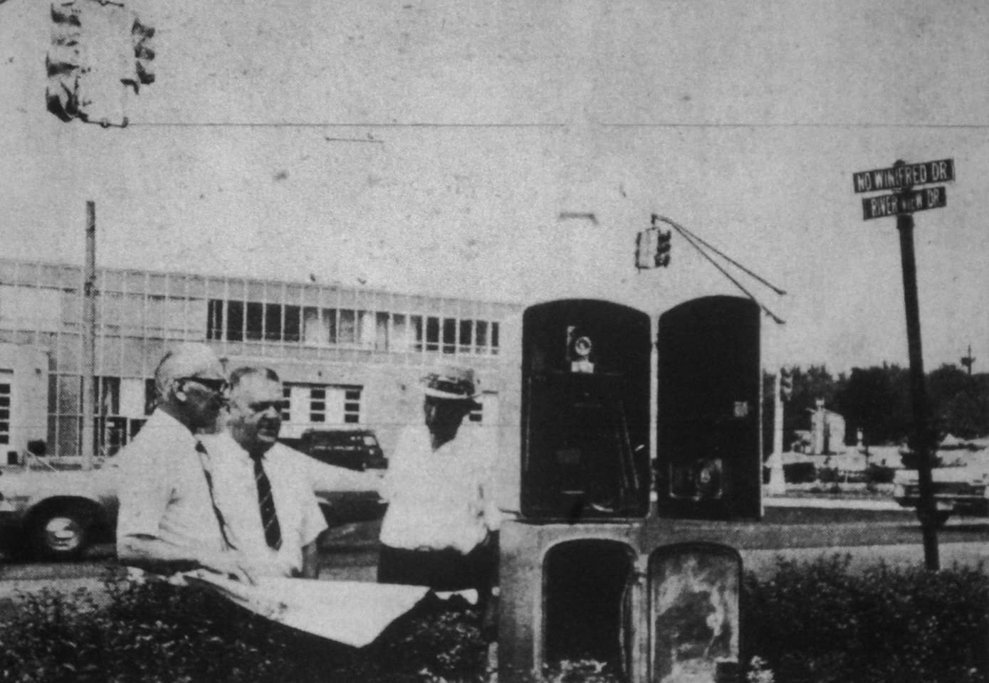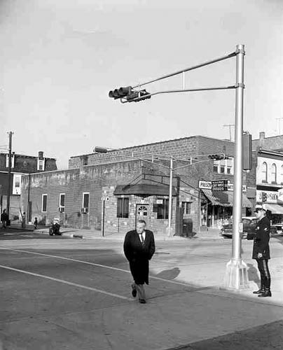 A new installation of LFE-Automatic signals, still wrapped in burlap, are about to be activated at Riverview and N. Winifred Drive in Totowa in 1970. I remember passing this corner many times in the ’70s. The building in the background contained a Thomas’s English Muffins thrift store back then. The 8″ signals facing Winifred are still there, I believe, but the 12″ arrow clusters facing Riverview Drive were, sadly, replaced by plastic 12″ doghouse style signals.