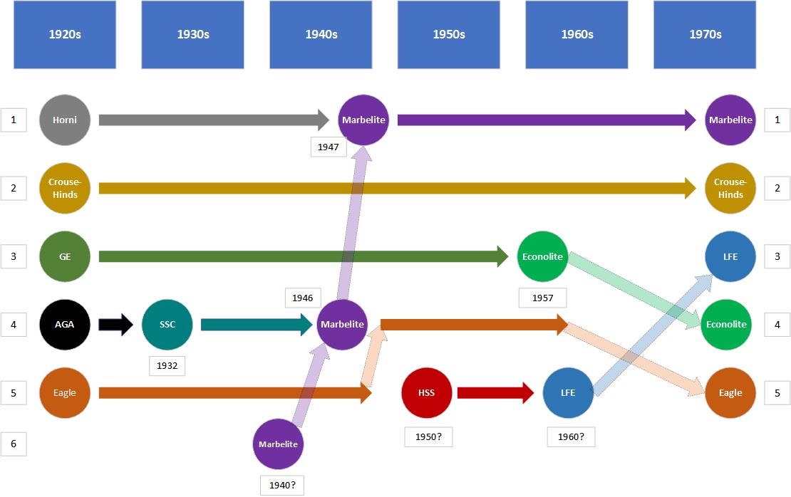 An excellent clue as to the six largest companies that ruled the traffic control business, nationwide, in the several years leading up to WWII is this FTC antitrust complaint regarding suspected price-fixing collusion between Crouse-Hinds, GE, Horni, Eagle, Signal Service, and Automatic Signal.
